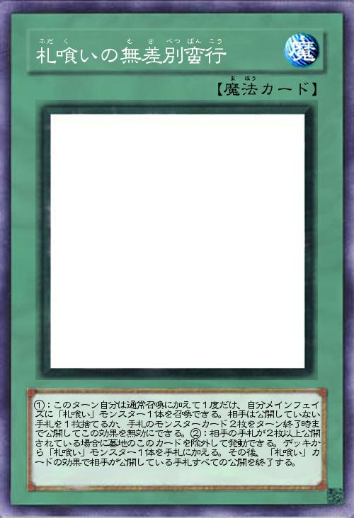| ①:このターン自分は通常召喚に加えて1度だけ、自分メインフェイズに「札喰い」モンスター1体を召喚できる。相手は公開していない手札を1枚捨てるか、手札のモンスターカード2枚をターン終了時まで公開してこの効果を無効にできる。②:相手の手札が2枚以上公開されている場合に墓地のこのカードを除外して発動できる。デッキから「札喰い」モンスター1体を手札に加える。その後、「札喰い」カードの効果で相手が公開している手札すべての公開を終了する。 | |||