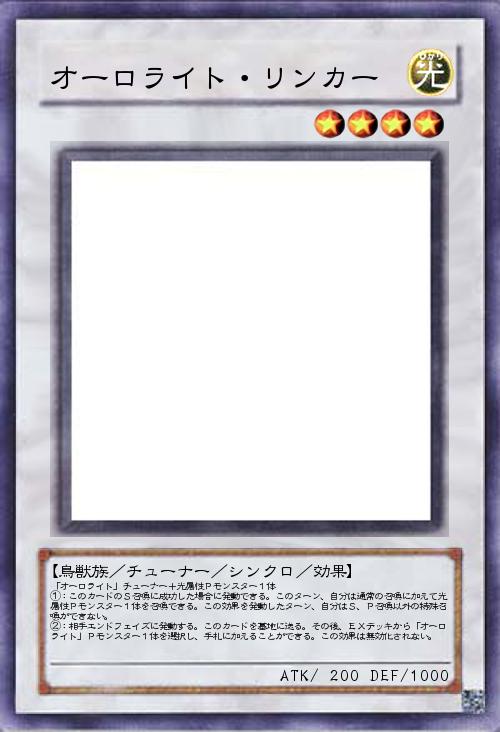 | 「オーロライト」チューナー+光属性Pモンスター1体 ①:このカードのS召喚に成功した場合に発動できる。このターン、自分は通常の召喚に加えて光属性Pモンスター1体を召喚できる。この効果を発動したターン、自分はS、P召喚以外の特殊召喚ができない。 ②:相手エンドフェイズに発動する。このカードを墓地に送る。その後、EXデッキから「オーロライト」Pモンスター1体を選択し、手札に加えることができる。この効果は無効化されない。 | |||