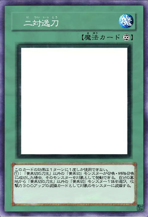 | このカードの効果は1ターンに1度しか使用できない。 ①:「黄泉切の刀主」以外の「黄泉切」モンスターが召喚・特殊召喚に成功した場合、そのモンスターを対象として発動できる。自分の墓地から「黄泉切の刀主」以外の「黄泉切」モンスター1体を選び、攻撃力300アップの装備カードとして対象のモンスターに装備する。 | |||