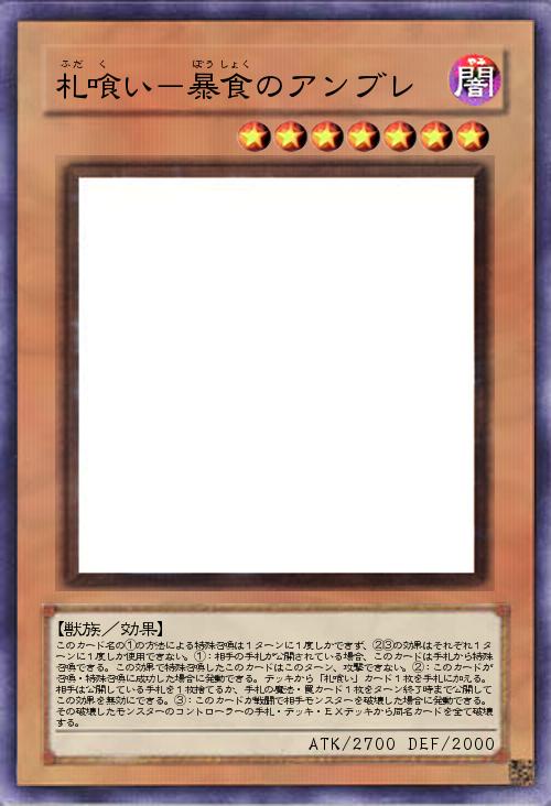 | このカード名の①の方法による特殊召喚は1ターンに1度しかできず、②③の効果はそれぞれ1ターンに1度しか使用できない。①:相手の手札が公開されている場合、このカードは手札から特殊召喚できる。この効果で特殊召喚したこのカードはこのターン、攻撃できない。②:このカードが召喚・特殊召喚に成功した場合に発動できる。デッキから「札喰い」カード1枚を手札に加える。相手は公開している手札を1枚捨てるか、手札の魔法・罠カード1枚をターン終了時まで公開してこの効果を無効にできる。③:このカードが戦闘で相手モンスターを破壊した場合に発動できる。その破壊したモンスターのコントローラーの手札・デッキ・EXデッキから同名カードを全て破壊する。 | |||