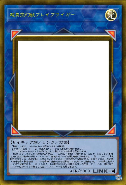 | 「異空」と名のついたサイキック族モンスター4種類以上 このカード名の(1)(2)の効果は1ターンに1度しか発動できない。 (1):このカードのリンク召喚に成功した場合に以下の効果を発動できる。 ・お互いのデッキの上から3枚を除外する。 ・3000LP支払い発動できる。このカードのリンク素材と同じ数だけ相手の手札・フィールド・墓地からカードを選び裏側で除外する。(2):1ターンに1度除外されている「異空幻獣」と名のついたモンスター1体を選んで発動できる。そのモンスターの召喚・特殊召喚・融合召喚・リンク召喚時に発動できる効果をLPを支払って発動する。この効果は相手ターンにも発動できる。(3):このカードが除外されている限りお互いの手札・フィールド・墓地のモンスターはサイキック族として扱いコントロールを変更できない。 | |||