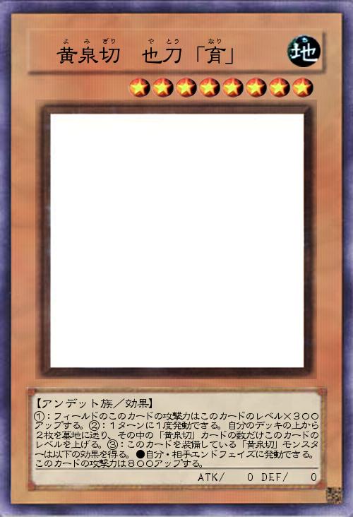 | ①:フィールドのこのカードの攻撃力はこのカードのレベル×300アップする。②:1ターンに1度発動できる。自分のデッキの上から2枚を墓地に送り、その中の「黄泉切」カードの数だけこのカードのレベルを上げる。③:このカードを装備している「黄泉切」モンスターは以下の効果を得る。●自分・相手エンドフェイズに発動できる。このカードの攻撃力は800アップする。 | |||