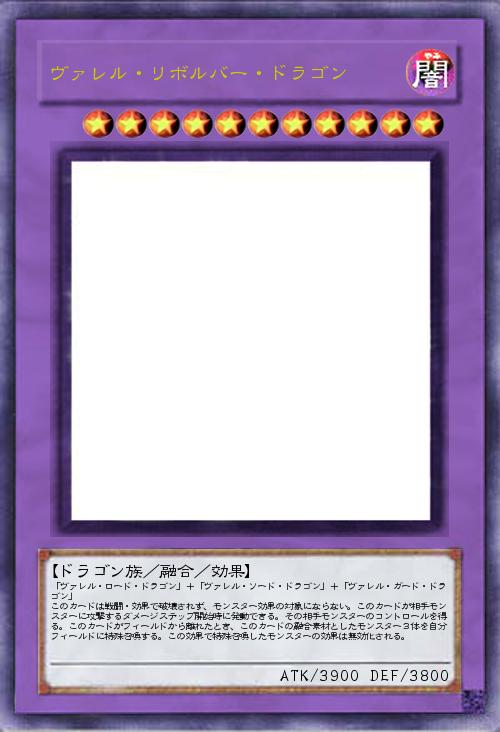 | 「ヴァレル・ロード・ドラゴン」+「ヴァレル・ソード・ドラゴン」+「ヴァレル・ガード・ドラゴン」 このカードは戦闘・効果で破壊されず、モンスター効果の対象にならない。このカードが相手モンスターに攻撃するダメージステップ開始時に発動できる。その相手モンスターのコントロールを得る。このカードがフィールドから離れたとき、このカードの融合素材としたモンスター3体を自分フィールドに特殊召喚する。この効果で特殊召喚したモンスターの効果は無効化される。 | |||
