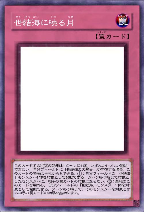 | このカード名の①②の効果は1ターンに1度、いずれか1つしか発動できない。自分フィールドに「世結海の大聖女」が存在する場合、このカードの発動は手札からもできる。①:自分フィールドの「世結海」モンスター1体を対象として発動できる。ターン終了時まで対象としたモンスターは、相手の罠カードの対象にならない。②:墓地のこのカードを除外し、自分フィールドの「世結海」モンスター1体を対象として発動できる。ターン終了時まで、そのモンスターを対象とする相手の罠カードの効果を無効にする。 | |||