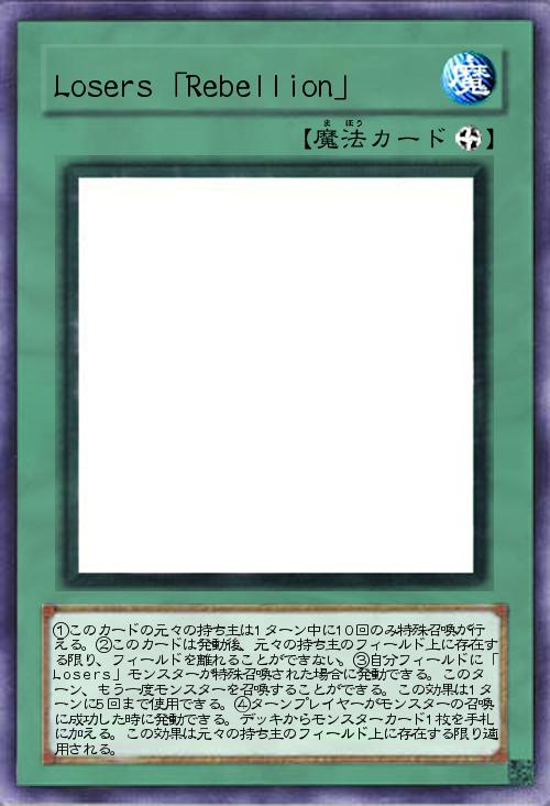 | ①このカードの元々の持ち主は1ターン中に10回のみ特殊召喚が行える。②このカードは発動後、元々の持ち主のフィールド上に存在する限り、フィールドを離れることができない。③自分フィールドに「Losers」モンスターが特殊召喚された場合に発動できる。このターン、もう一度モンスターを召喚することができる。この効果は1ターンに5回まで使用できる。④ターンプレイヤーがモンスターの召喚に成功した時に発動できる。デッキからモンスターカード1枚を手札に加える。この効果は元々の持ち主のフィールド上に存在する限り適用される。 | |||