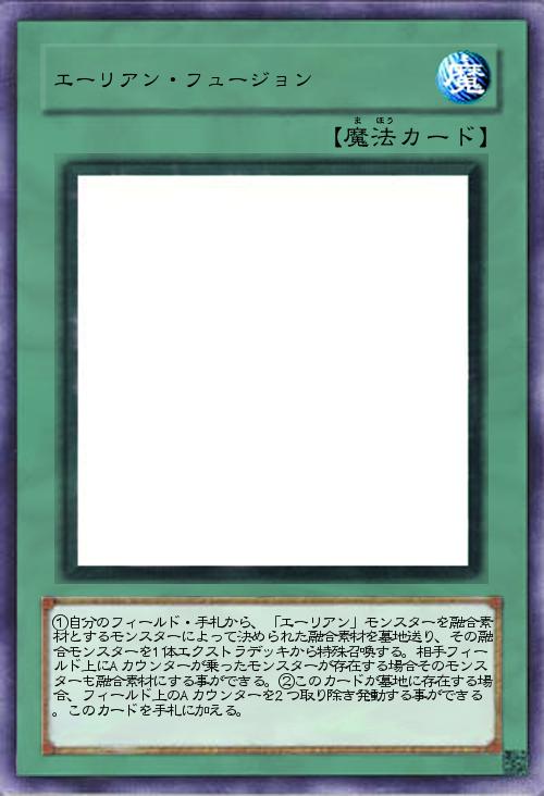 | ①自分のフィールド・手札から、「エーリアン」モンスターを融合素材とするモンスターによって決められた融合素材を墓地送り、その融合モンスターを1体エクストラデッキから特殊召喚する。相手フィールド上にAカウンターが乗ったモンスターが存在する場合そのモンスターも融合素材にする事ができる。②このカードが墓地に存在する場合、フィールド上のAカウンターを2つ取り除き発動する事ができる。このカードを手札に加える。 | |||