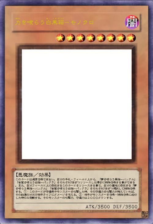| このカードは通常召喚できない。自分の手札・フィールド上から、「夢を喰らう黒箱-バックル」「希望を喰らう白箱-パックラ」をそれぞれ1体ずつリリースした場合に特殊召喚する事ができる。また、自分フィールド上に存在するこのカードをリリースする事で、自分の墓地に存在する「夢を喰らう黒箱-バックル」「希望を喰らう白箱-パックラ」をそれぞれ1体ずつ選択して特殊召喚する。①:このカードが守備表示モンスターを攻撃した時、その守備力を攻撃力が超えていれば、その数値の分だけ相手ライフにダメージを与える。②:相手がモンスターを召喚・特殊召喚に成功した時のみ発動する。そのモンスターの攻撃力、守備力は2000ダウンする。 | |||