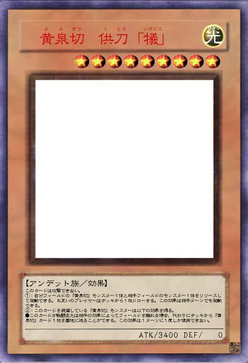 | このカードは攻撃できない。 ①:自分フィールドの「黄泉切」モンスター1体と相手フィールドのモンスター1体をリリースして発動できる。お互いのプレイヤーはデッキから1枚ドローする。この効果は相手ターンでも発動できる。 ②:このカードを装備している「黄泉切」モンスターは以下の効果を得る。 ●このカードが戦闘または相手の効果によってフィールドを離れる場合、代わりにデッキから「黄泉切」カード1枚を墓地に送ることができる。この効果は1ターンに1度しか使用できない。 | |||