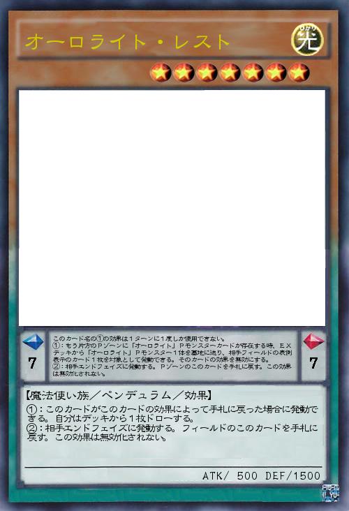 | このカード名の①の効果は1ターンに1度しか使用できない。 ①:もう片方のPゾーンに「オーロライト」Pモンスターカードが存在する時、EXデッキから「オーロライト」Pモンスター1体を墓地に送り、相手フィールドの表側表示のカード1枚を対象として発動できる。そのカードの効果を無効にする。 ②:相手エンドフェイズに発動する。Pゾーンのこのカードを手札に戻す。この効果は無効化されない。 | |||