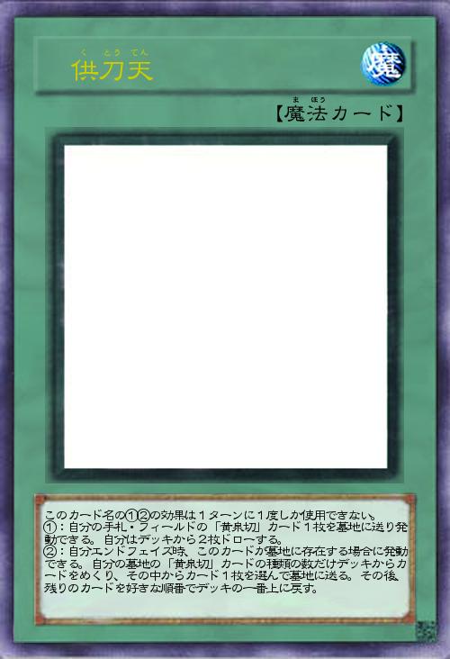 | このカード名の①②の効果は1ターンに1度しか使用できない。 ①:自分の手札・フィールドの「黄泉切」カード1枚を墓地に送り発動できる。自分はデッキから2枚ドローする。 ②:自分エンドフェイズ時、このカードが墓地に存在する場合に発動できる。自分の墓地の「黄泉切」カードの種類の数だけデッキからカードをめくり、その中からカード1枚を選んで墓地に送る。その後、残りのカードを好きな順番でデッキの一番上に戻す。 | |||