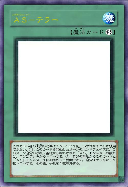 | このカード名の①②の効果は1ターンに1度、いずれか1つしか使用できない。①:このカードを発動したターンのエンドフェイズに、このターン自分の手札・墓地から除外された「AS」モンスターの数だけ、自分はデッキからドローする。②:自分の墓地からこのカードと「AS」モンスター1体を除外して発動できる。自分はデッキから1枚ドローする。その後、手札を1枚除外する。 | |||