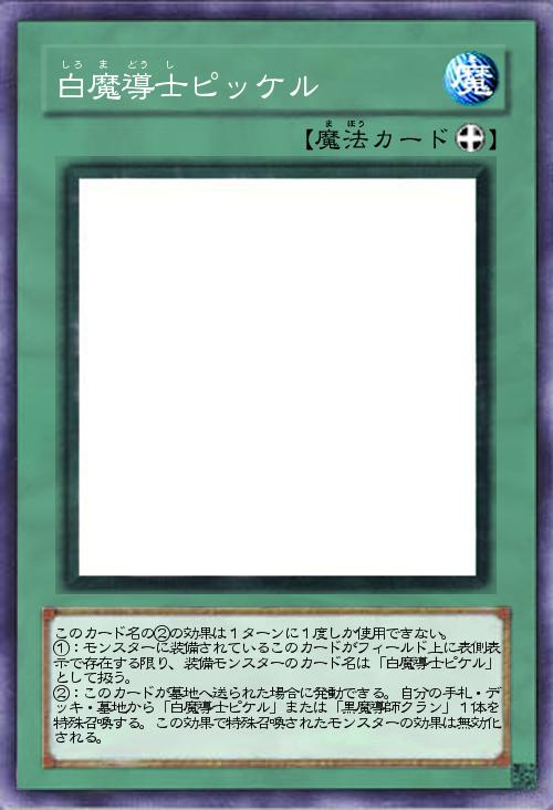 | このカード名の②の効果は1ターンに1度しか使用できない。 ①:モンスターに装備されているこのカードがフィールド上に表側表示で存在する限り、装備モンスターのカード名は「白魔導士ピケル」として扱う。 ②:このカードが墓地へ送られた場合に発動できる。自分の手札・デッキ・墓地から「白魔導士ピケル」または「黒魔導師クラン」1体を特殊召喚する。この効果で特殊召喚されたモンスターの効果は無効化される。 | |||