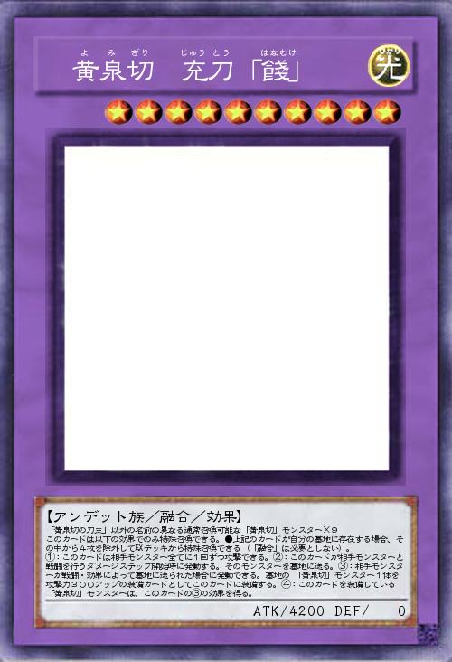 | 「黄泉切の刀主」以外の名前の異なる通常召喚可能な「黄泉切」モンスター×9 このカードは以下の効果でのみ特殊召喚できる。●上記のカードが自分の墓地に存在する場合、その中から4枚を除外してEXデッキから特殊召喚できる(「融合」は必要としない)。 ①:このカードは相手モンスター全てに1回ずつ攻撃できる。②:このカードが相手モンスターと戦闘を行うダメージステップ開始時に発動する。そのモンスターを墓地に送る。③:相手モンスターが戦闘・効果によって墓地に送られた場合に発動できる。墓地の 「黄泉切」モンスター1体を攻撃力300アップの装備カードとしてこのカードに装備する。④:このカードを装備している 「黄泉切」モンスターは、このカードの③の効果を得る。 | |||