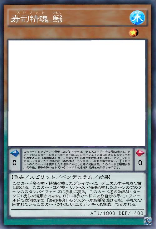 モンスター効果①の記述は「相手によって自分の手札、フィールドの「寿司精魂」モンスターが効果を適用、リリース、墓地に送られる時、代わりに手札で公開されているこのカードをEXデッキに表側表示で送る」がOCGっぽくていいかも。」(2018-07-17 18:06)