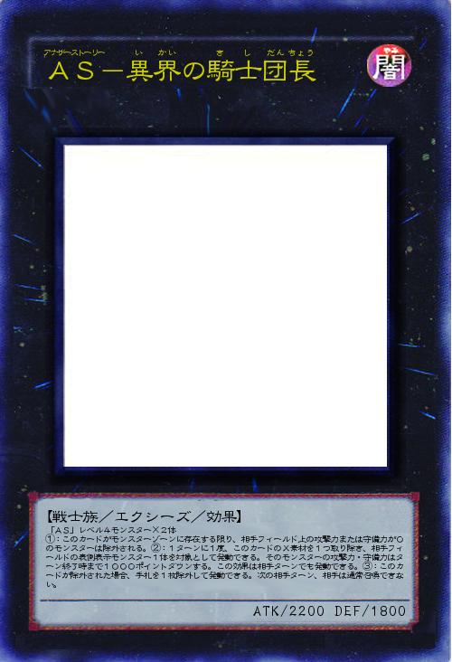 | 「AS」レベル4モンスター×2体 ①:このカードがモンスターゾーンに存在する限り、相手フィールド上の攻撃力または守備力が0のモンスターは除外される。②:1ターンに1度、このカードのX素材を1つ取り除き、相手フィールドの表側表示モンスター1体を対象として発動できる。そのモンスターの攻撃力・守備力はターン終了時まで1000ポイントダウンする。この効果は相手ターンでも発動できる。③:このカードが除外された場合、手札を1枚除外して発動できる。次の相手ターン、相手は通常召喚できない。 | |||