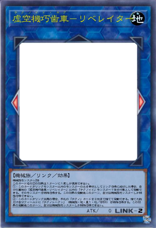 | 機械族モンスター2体 このカード名の②の効果は1ターンに1度しか使用できない。 ①:このカードがリンクモンスター以外のモンスターのみを素材としてリンク召喚に成功した場合、自分の墓地の「虚空機巧歯車-リベレイター」以外の「テクノイド」モンスター1体を対象として発動できる。そのモンスターを特殊召喚する。この効果の発動後このターン、自分は機械族モンスターしか特殊召喚できない。 ②:このカードがリンク状態の場合、手札の「テクノ」カードを2枚まで捨てて発動できる。捨てた数だけ自分フィールドに「テクノトークン」(機械族・地・星1・攻/守500)を特殊召喚する。この効果の発動後このターン、自分は機械族モンスターしか特殊召喚できない。 | |||