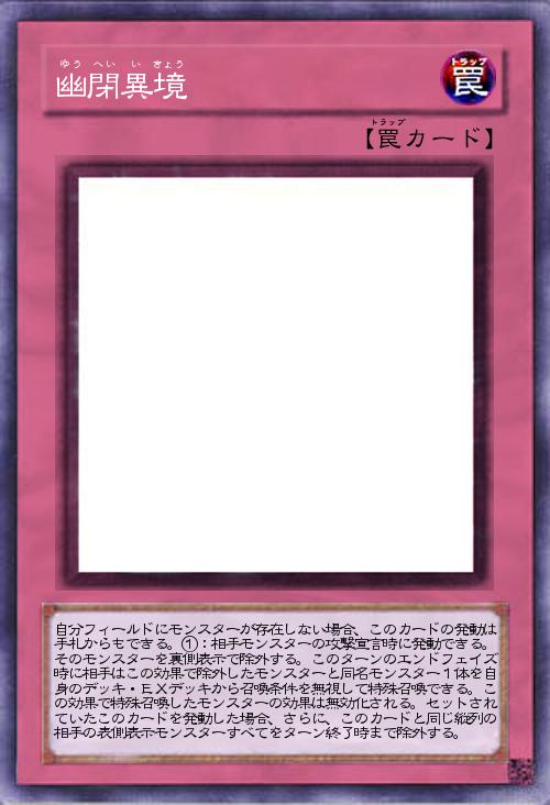 | 自分フィールドにモンスターが存在しない場合、このカードの発動は手札からもできる。①:相手モンスターの攻撃宣言時に発動できる。そのモンスターを裏側表示で除外する。このターンのエンドフェイズ時に相手はこの効果で除外したモンスターと同名モンスター1体を自身のデッキ・EXデッキから召喚条件を無視して特殊召喚できる。この効果で特殊召喚したモンスターの効果は無効化される。セットされていたこのカードを発動した場合、さらに、このカードと同じ縦列の相手の表側表示モンスターすべてをターン終了時まで除外する。 | |||