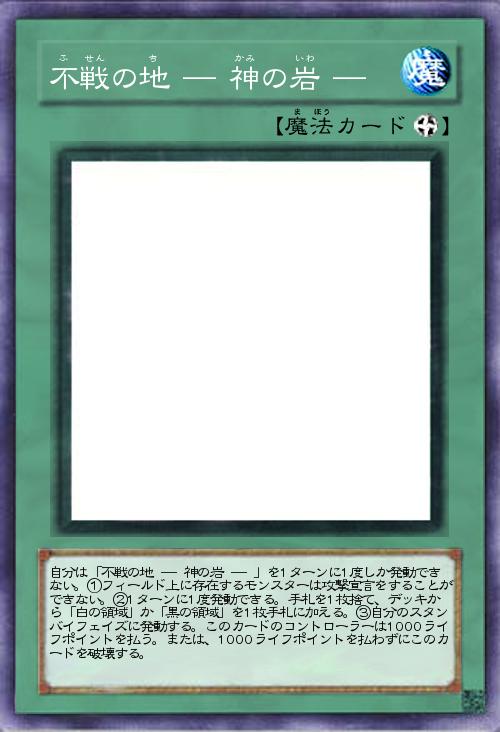 | 自分は「不戦の地 ― 神の岩 ― 」を1ターンに1度しか発動できない。①フィールド上に存在するモンスターは攻撃宣言をすることができない。②1ターンに1度発動できる。手札を1枚捨て、デッキから「白の領域」か「黒の領域」を1枚手札に加える。③自分のスタンバイフェイズに発動する。このカードのコントローラーは1000ライフポイントを払う。または、1000ライフポイントを払わずにこのカードを破壊する。 | |||