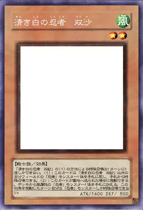 | 「清き白の忍者 双紗」の(1)の方法による特殊召喚は1ターンに1度しかできない。(1):このカードは「清き白の忍者 双紗」以外の自分フィールドの「忍者」モンスター1体を手札に戻し、手札から特殊召喚できる。(2):このカードが墓地へ送られた場合に発動できる。デッキから風属性の「忍者」モンスター1体を手札に加える。この効果を発動したターン自分は「忍者」モンスターしか特殊召喚できない。 | |||