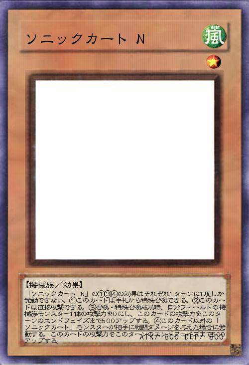 | 「ソニックカート N」の①③④の効果はそれぞれ1ターンに1度しか発動できない。①このカードは手札から特殊召喚できる。②このカードは直接攻撃できる。③召喚・特殊召喚成功時、自分フィールドの機械族モンスター1体の攻撃力を0にし、このカードの攻撃力をこのターンのエンドフェイズまで500アップする。④このカード以外の「ソニックカート」モンスターが相手に戦闘ダメージを与えた場合に発動する。このカードの攻撃力をこのターンのエンドフェイズまで500アップする。 | |||