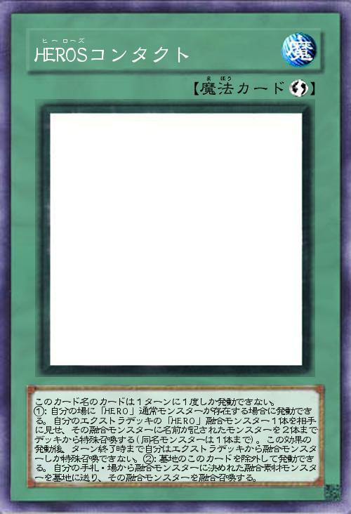 | このカード名のカードは1ターンに1度しか発動できない。 ①:自分の場に「HERO」通常モンスターが存在する場合に発動できる。自分のエクストラデッキの「HERO」融合モンスター1体を相手に見せ、その融合モンスターに名前が記されたモンスターを2体までデッキから特殊召喚する(同名モンスターは1体まで)。この効果の発動後、ターン終了時まで自分はエクストラデッキから融合モンスターしか特殊召喚できない。②:墓地のこのカードを除外して発動できる。自分の手札・場から融合モンスターに決めれた融合素材モンスターを墓地に送り、その融合モンスターを融合召喚する。 | |||