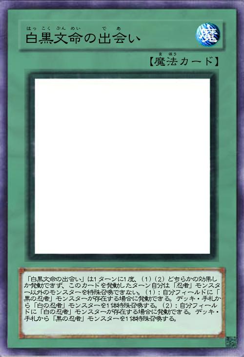 | 「白黒文命の出会い」は1ターンに1度、(1)(2)どちらかの効果しか発動できず、このカードを発動したターン自分は「忍者」モンスター以外のモンスターを特殊召喚できない。(1):自分フィールドに「黒の忍者」モンスターが存在する場合に発動できる。デッキ・手札から「白の忍者」モンスターを1体特殊召喚する。(2):自分フィールドに「白の忍者」モンスターが存在する場合に発動できる。デッキ・手札から「黒の忍者」モンスターを1体特殊召喚する。 | |||