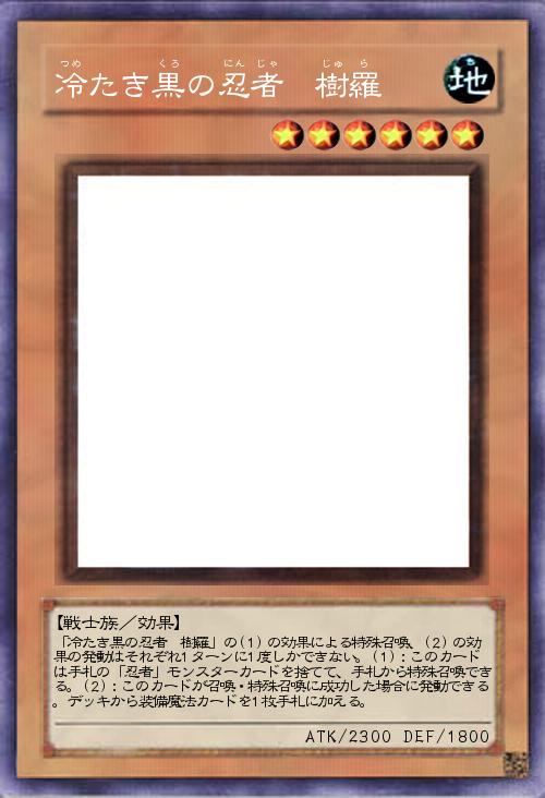 | 「冷たき黒の忍者 樹羅」の(1)の効果による特殊召喚、(2)の効果の発動はそれぞれ1ターンに1度しかできない。(1):このカードは手札の「忍者」モンスターカードを捨てて、手札から特殊召喚できる。(2):このカードが召喚・特殊召喚に成功した場合に発動できる。デッキから装備魔法カードを1枚手札に加える。 | |||
