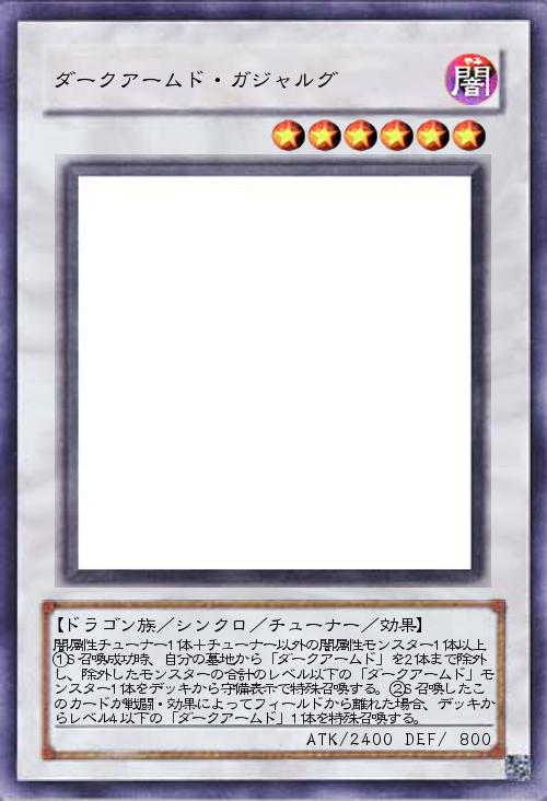| 闇属性チューナー1体+チューナー以外の闇属性モンスター1体以上①S召喚成功時、自分の墓地から「ダークアームド」を2体まで除外し、除外したモンスターの合計のレベル以下の「ダークアームド」モンスター1体をデッキから守備表示で特殊召喚する。②S召喚したこのカードが戦闘・効果によってフィールドから離れた場合、デッキからレベル4以下の「ダークアームド」1体を特殊召喚する。 | |||