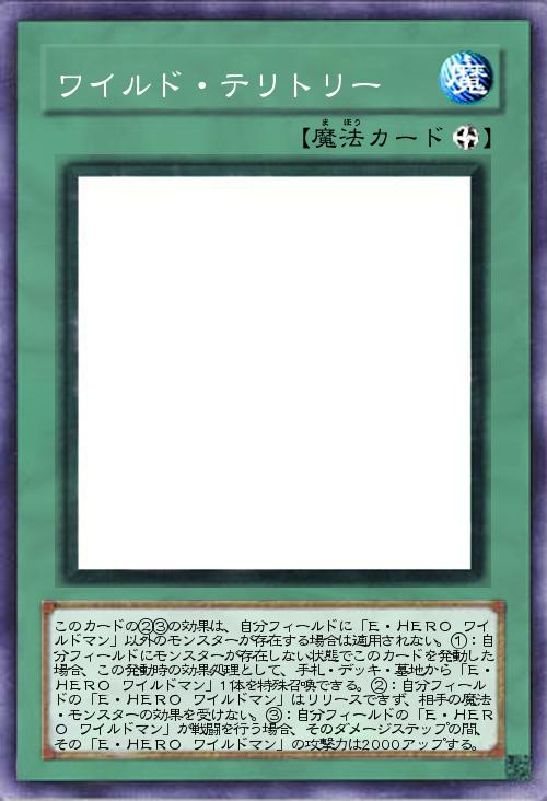 | このカードの②③の効果は、自分フィールドに「E・HERO ワイルドマン」以外のモンスターが存在する場合は適用されない。①:自分フィールドにモンスターが存在しない状態でこのカードを発動した場合、この発動時の効果処理として、手札・デッキ・墓地から「E・HERO ワイルドマン」1体を特殊召喚できる。②:自分フィールドの「E・HERO ワイルドマン」はリリースできず、相手の魔法・モンスターの効果を受けない。③:自分フィールドの「E・HERO ワイルドマン」が戦闘を行う場合、そのダメージステップの間、その「E・HERO ワイルドマン」の攻撃力は2000アップする。 | |||
