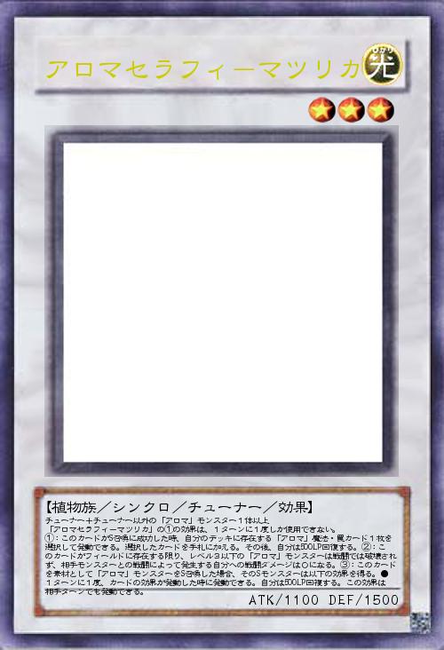 | チューナー+チューナー以外の「アロマ」モンスター1体以上 「アロマセラフィ-マツリカ」の①の効果は、1ターンに1度しか使用できない。 ①:このカードがS召喚に成功した時、自分のデッキに存在する「アロマ」魔法・罠カード1枚を選択して発動できる。選択したカードを手札に加える。その後、自分は500LP回復する。②:このカードがフィールドに存在する限り、レベル3以下の「アロマ」モンスターは戦闘では破壊されず、相手モンスターとの戦闘によって発生する自分への戦闘ダメージは0になる。③:このカードを素材として「アロマ」モンスターをS召喚した場合、そのSモンスターは以下の効果を得る。●1ターンに1度、カードの効果が発動した時に発動できる。自分は500LP回複する。この効果は相手ターンでも発動できる。 | |||