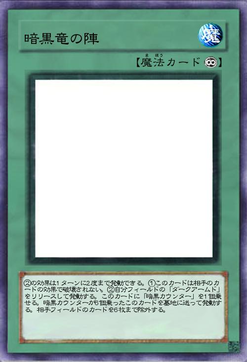 | ②の効果は1ターンに2度まで発動できる。①このカードは相手のカードの効果で破壊されない。②自分フィールドの「ダークアームド」をリリースして発動する。このカードに「暗黒カウンター」を1個乗せる。暗黒カウンターが6個乗ったこのカードを墓地に送って発動する。相手フィールドのカードを6枚まで除外する。 | |||