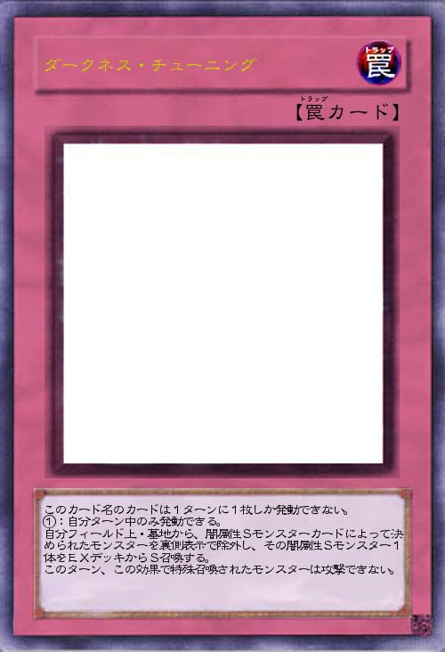 | このカード名のカードは1ターンに1枚しか発動できない。 ①:自分ターン中のみ発動できる。 自分フィールド上・墓地から、闇属性Sモンスターカードによって決められたモンスターを裏側表示で除外し、その闇属性Sモンスター1体をEXデッキからS召喚する。 このターン、この効果で特殊召喚されたモンスターは攻撃できない。 | |||