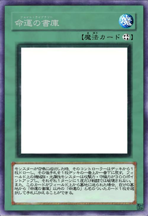 | モンスターが召喚に成功した時、そのコントローラーはデッキから1枚ドローし、その後手札を1枚デッキの一番上か一番下に戻す。フィールド上の機械族・光属性モンスターは攻撃力・守備力が300ポイントアップし、それぞれ1ターンに1度だけ戦闘では破壊されない。また、このカードがフィールド上から墓地に送られた場合、自分の墓地から「命運の書庫」以外の「命運の」と名のついたカード1枚を選択して手札に加えることができる。 | |||
