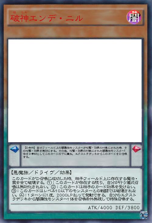 | 【D条件】自分フィールド上の闇属性モンスターが攻撃・効果の対象にされた時、その攻撃・効果を無効にする。その後、攻撃・効果の対象にされた闇属性モンスター1体をD素材としてこのカードの下に重ね、エクストラデッキからこのカードをD召喚する。 | |||
