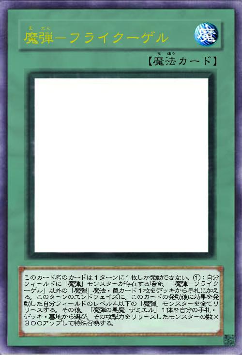| このカード名のカードは1ターンに1枚しか発動できない。①:自分フィールドに「魔弾」モンスターが存在する場合、「魔弾-フライクーゲル」以外の「魔弾」魔法・罠カード1枚をデッキから手札に加える。このターンのエンドフェイズに、このカードの発動後に効果を発動した自分フィールドのレベル4以下の「魔弾」モンスターを全てリリースする。その後、「魔弾の悪魔 ザミエル」1体を自分の手札・デッキ・墓地から選び、その攻撃力をリリースしたモンスターの数×300アップして特殊召喚する。 | |||
