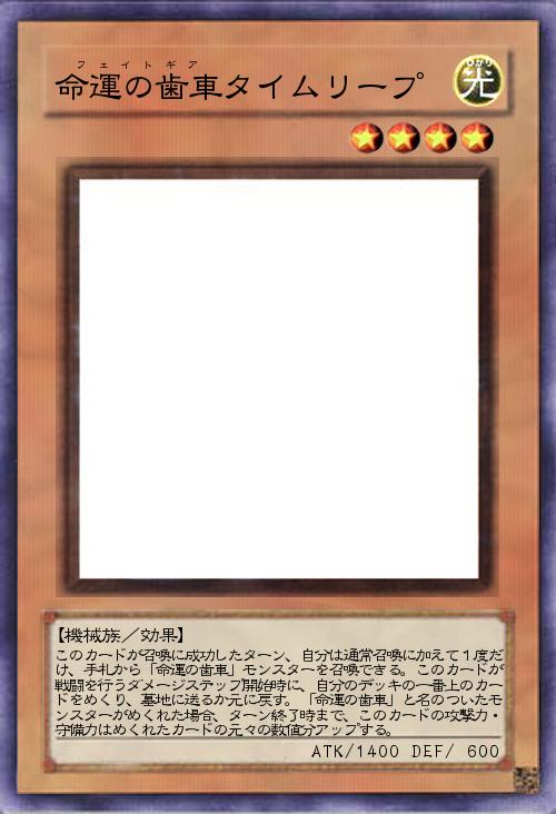 | このカードが召喚に成功したターン、自分は通常召喚に加えて1度だけ、手札から「命運の歯車」モンスターを召喚できる。このカードが戦闘を行うダメージステップ開始時に、自分のデッキの一番上のカードをめくり、墓地に送るか元に戻す。「命運の歯車」と名のついたモンスターがめくれた場合、ターン終了時まで、このカードの攻撃力・守備力はめくれたカードの元々の数値分アップする。 | |||