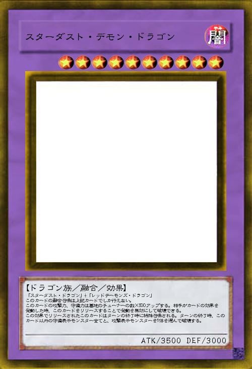 | 「スターダスト・ドラゴン」+「レッドデーモンズ・ドラゴン」 このカードの融合召喚は上記カードでしか行えない。 このカードの攻撃力、守備力は墓地のチューナーの数×500アップする。相手がカードの効果を発動した時、このカードをリリースすることで発動を無効にして破壊できる。 この効果でリリースされたこのカードはターンの終了時に特殊召喚される。ターンの終了時、このカード以外の守備表示モンスター全てと、攻撃表示モンスターを1体を選んで破壊する。 | |||