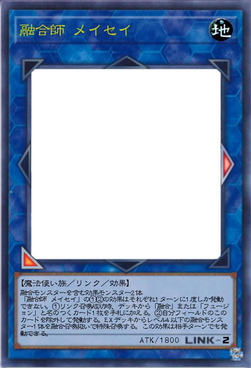 | 融合モンスターを含む効果モンスター2体 「融合師 メイセイ」の①②の効果はそれぞれ1ターンに1度しか発動できない。①リンク召喚成功時、デッキから「融合」または「フュージョン」と名のつくカード1枚を手札に加える。②自分フィールドのこのカードを除外して発動する。EXデッキからレベル4以下の融合モンスター1体を融合召喚扱いで特殊召喚する。この効果は相手ターンでも発動できる。 | |||