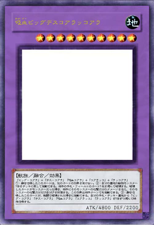 | 「ビッグ・コアラ」+「デス・コアラ」「吸血コアラ」+「コアラッコ」+「ラッコアラ」 ①:融合召喚したこのカードは、他のカードの効果を受けない。②:自分の墓地の獣族モンスター1体をデッキに戻して発動できる。相手の手札・フィールドのカード1枚を選んで破壊する。破壊したカードがモンスターだった場合、相手にそのモンスターの攻撃力分のダメージを与え、そのモンスターの攻撃力分だけ自分LPを回復する。この効果は相手ターンでも発動できる。③:融合召喚したこのカードが、戦闘で破壊された場合に発動できる。自分の手札・デッキ・墓地から「ビッグ・コアラ」「デス・コアラ」「吸血コアラ」「コアラッコ」「ラッコアラ」を1体ずつ選んで特殊召喚する。 | |||