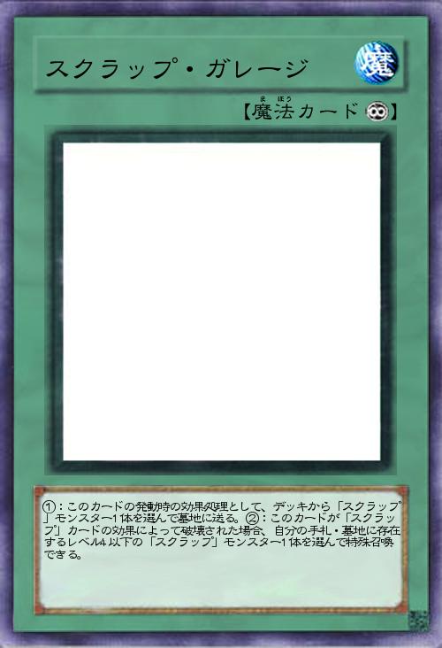 | ①:このカードの発動時の効果処理として、デッキから「スクラップ」モンスター1体を選んで墓地に送る。②:このカードが「スクラップ」カードの効果によって破壊された場合、自分の手札・墓地に存在するレベル4以下の「スクラップ」モンスター1体を選んで特殊召喚できる。 | |||
