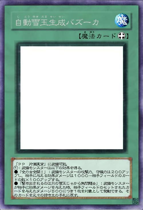 | 「PP 片瀬真宵」に装備可能。 ①:装備モンスターは以下の効果を得る。 ●「全力☆全開!」:装備モンスターの攻撃力、守備力は200アップし、相手に与える効果ダメージは1000-相手フィールドのカードの数×100アップする。 ●「撃ち出されるのは只の雪玉じゃから無問題☆」:装備モンスターが相手に効果ダメージを与えた時、相手フィールドのセットされたカードを与えたダメージ500につき1枚を対象として発動できる。そのカードを元々の持ち主の手札に戻す。 | |||
