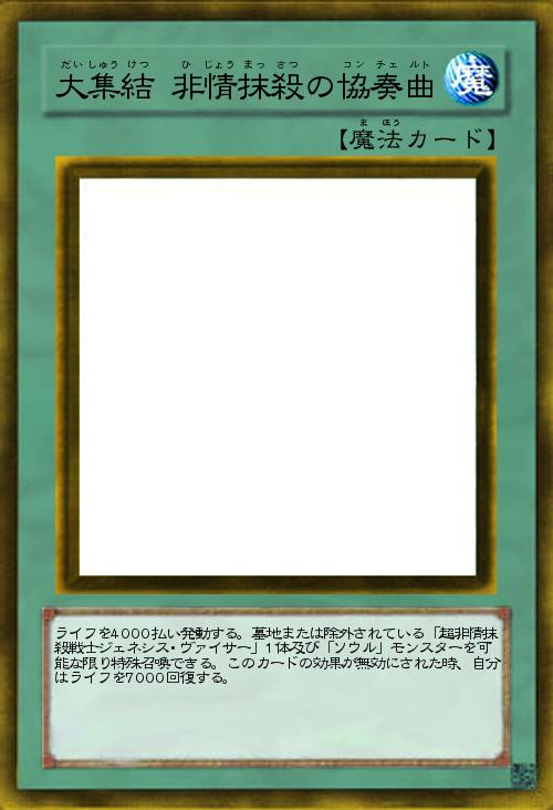 | ライフを4000払い発動する。墓地または除外されている「超非情抹殺戦士ジェネシス・ヴァイサー」1体及び「ソウル」モンスターを可能な限り特殊召喚できる。このカードの効果が無効にされた時、自分はライフを7000回復する。 | |||