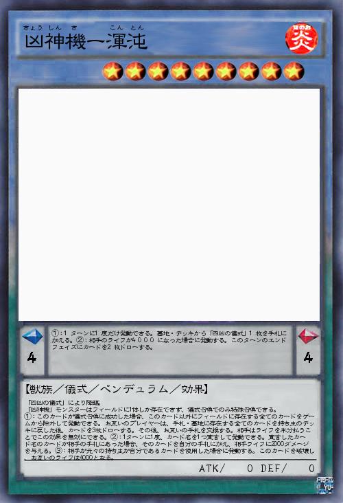 | 「四凶の儀式」により降臨。 「凶神機」モンスターはフィールドに1体しか存在できず、儀式召喚でのみ特殊召喚できる。 ①:このカードが儀式召喚に成功した場合、このカード以外にフィールドに存在する全てのカードをゲームから除外して発動できる。お互いのプレイヤーは、手札・墓地に存在する全てのカードを持ち主のデッキに戻した後、カードを3枚ドローする。その後、お互いの手札を交換する。相手はライフを半分払うことでこの効果を無効にできる。②:1ターンに1度、カード名を1つ宣言して発動できる。宣言したカード名のカードが相手の手札にあった場合、そのカードを自分の手札に加え、相手ライフに2000ダメージを与える。③:相手が元々の持ち主が自分であるカードを使用した場合に発動する。このカードを破壊し、お互いのライフは4000となる。 | |||