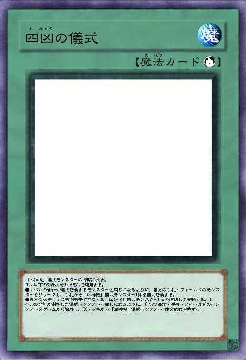 | 「凶神機」儀式モンスターの降臨に必要。 ①:以下の効果から1つ選んで適用する。 ●レベルの合計が儀式召喚するモンスターと同じになるように、自分の手札・フィールドのモンスターをリリースし、手札から「凶神機」儀式モンスター1体を儀式召喚する。 ●自分のEXデッキに表側表示で存在する「凶神機」儀式モンスター1体を選択して発動する。レベルの合計が選択した儀式モンスターと同じになるように、自分の墓地・手札・フィールドのモンスターをゲームから除外し、EXデッキから「凶神機」儀式モンスター1体を儀式召喚する。 | |||