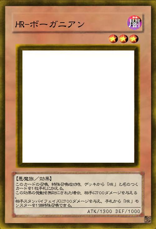 | このカードの召喚、特殊召喚成功時、デッキから「HR」と名のつくカードを1枚手札に加える。 この効果の発動を無効にされた場合、相手に700ダメージを与える。 相手スタンバイフェイズに700ダメージを与え、手札から「HR」モンスターを1体特殊召喚できる。 | |||