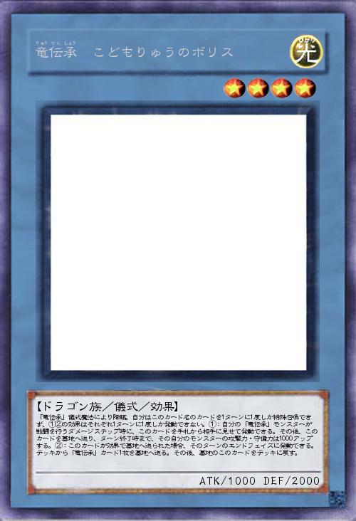 | 「竜伝承」儀式魔法により降臨。自分はこのカード名のカードを1ターンに1度しか特殊召喚できず、①②の効果はそれぞれ1ターンに1度しか発動できない。①:自分の「竜伝承」モンスターが戦闘を行うダメージステップ時に、このカードを手札から相手に見せて発動できる。その後、このカードを墓地へ送り、ターン終了時まで、その自分のモンスターの攻撃力・守備力は1000アップする。②:このカードが効果で墓地へ送られた場合、そのターンのエンドフェイズに発動できる。デッキから「竜伝承」カード1枚を墓地へ送る。その後、墓地のこのカードをデッキに戻す。 | |||