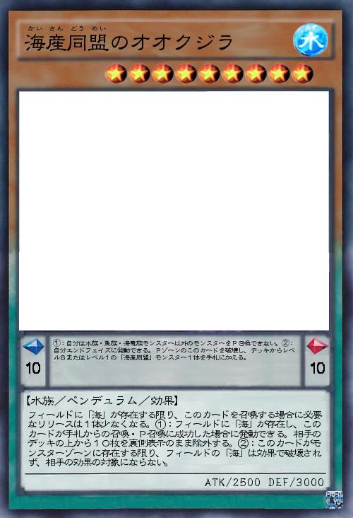 | フィールドに「海」が存在する限り、このカードを召喚する場合に必要なリリースは1体少なくなる。①:フィールドに「海」が存在し、このカードが手札からの召喚・P召喚に成功した場合に発動できる。相手のデッキの上から10枚を裏側表示のまま除外する。②:このカードがモンスターゾーンに存在する限り、フィールドの「海」は効果で破壊されず、相手の効果の対象にならない。 | |||