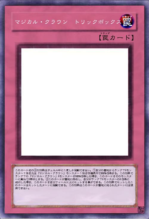 | このカード名の②の効果はデュエル中に1度しか発動できない。①自分の墓地からランク7Xモンスター1体または「マジカル・クラウン」モンスター1体を守備表示で特殊召喚する。この効果でランク7の「マジカル・クラウン」Xモンスターを特殊召喚した場合、このカードをそのモンスターに重ねてX素材とする。②このカードが墓地に存在し、自分がランク7XモンスターのX召喚に成功した場合、このカードを自分フィールド上にセットする事ができる。この効果でセットしたこのカードはセットしたターンに発動できる。この効果はこのカードが墓地に送られたターンには使用できない。 | |||