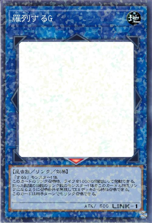 | 「するG」モンスター1体 このカードのリンク召喚時、ライフを1000の倍数払って発動できる。 払った数値の倍数のリンク数のモンスター1体をこのカードと相互リンクになるように召喚条件を無視してEXデッキから特殊召喚できる。 このカードは相手ターンでもリンク召喚できる。 | |||