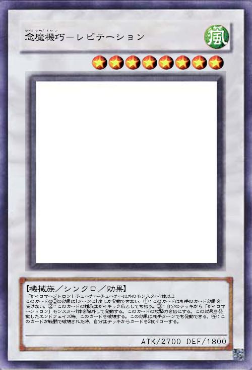 | 「サイコマージトロン」チューナー+チューナー以外のモンスター1体以上 このカードの③の効果は1ターンに1度しか発動できない。①:このカードは相手のカード効果を受けない。②:このカードの種族はサイキック族としても扱う。③:自分のデッキから「サイコマージトロン」モンスター1体を除外して発動する。このカードの攻撃力を倍にする。この効果を発動したエンドフェイズ時、このカードを破壊する。この効果は相手ターンでも発動できる。④:このカードが戦闘で破壊された時、自分はデッキからカードを2枚ドローする。 | |||